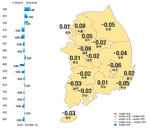 한편, 세종시는 오랜 하락세에서 벗어나 0.10%의 상승률을 기록하며 상대적으로 높은 상승세를 보였다. 이는 세종시 내 일부 신규 단지의 입주 물량 감소와 기존 매물의 소진이 영향을 미친 것으로 풀이된다.