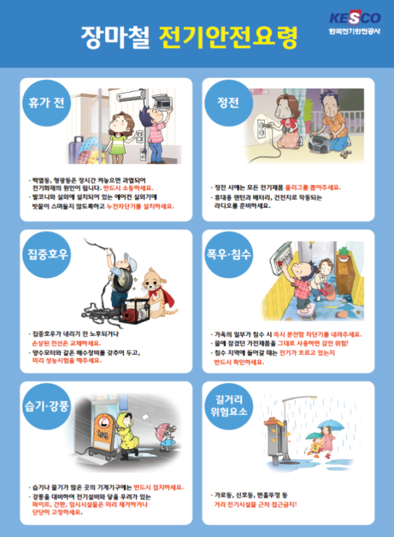 조덕진 안전처 안전기획과장은 “전기안전사고 예방을 위해서는 누전차단기를 설치하고 이를 정기적으로 점검하는 것이 중요하다”며 “특히 비가 오는 날에는 가로등과 신호등 뿐만 아니라 입간판, 에어컨 실외기 등의 접촉을 최대한 피해야 한다”고 조언했다.