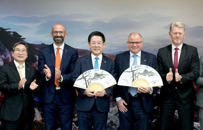 면담 후 해상풍력 터빈이 그려진 전통부채에 김영록 지사와 헨릭 회장이 서명하고 교환하면서 상호 협력 의지를 다졌다.