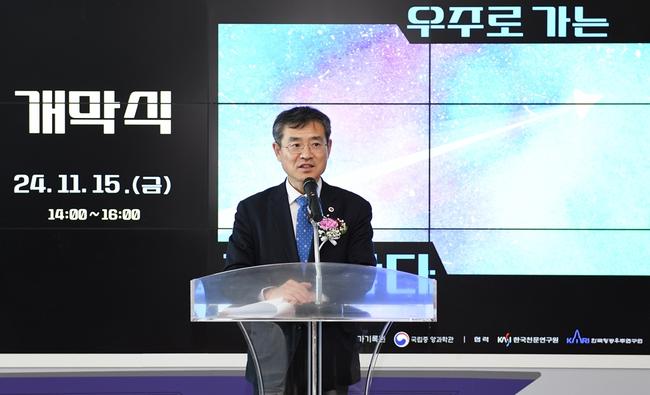 이용철 행정안전부 국가기록원장이 15일 오후 대전 유성구 국립중앙과학관 창의나래관에서 열린 기획전시 `우주로 가는 길을 찾다` 개막식에서 개회사를 하고 있다.