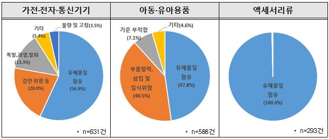 특히 가전·전자·통신기기는 631건(33.0%)으로 차단된 제품 중 가장 높은 비중을 차지했으며, 이들 중 56.9%는 납이나 카드뮴 등 유해물질 함유가 원인이었다. 아동·유아용품에서는 소형 부품 탈락으로 인한 질식 위험 사례가 다수 발견됐고, 액세서리류는 전량 중금속 과다 함유로 차단됐다.