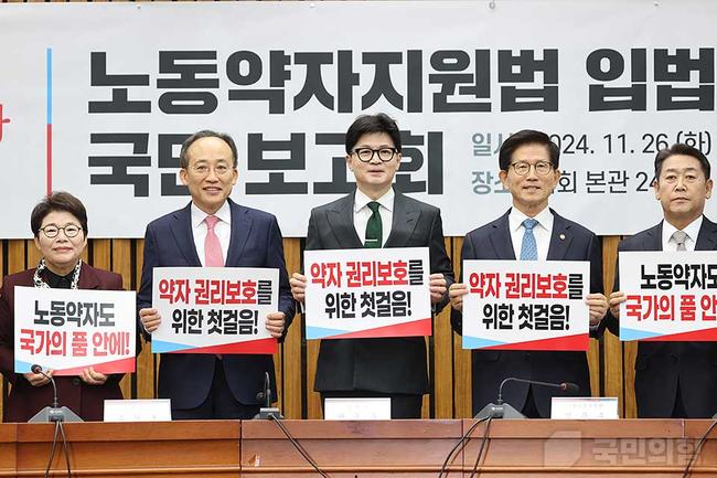 [일간환경연합 신상미 기자] 국민의힘 한동훈 대표는 26일 노동약자지원법 입법발의 국민 보고회에서 노동약자를 위한 새로운 법안을 발표하며, 법적 보호 사각지대를 해소하겠다는 의지를 밝혔다. 그는 "노조와 법적 울타리가 없는 노동약자들이 기댈 언덕을 마련하겠다"고 말했다.
