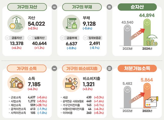 통계청이 금융감독원 및 한국은행과 함께 실시한 2024년 가계금융복지조사 결과에 따르면, 2024년 3월 말 기준 한국 가구의 평균 자산은 5억 4,022만 원, 부채는 9,128만 원으로, 순자산은 4억 4,894만 원으로 집계됐다. 이는 전년 대비 자산 2.5%, 순자산 3.1% 증가한 수치다.