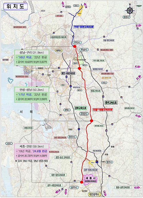 한국도로공사가 이미 착수한 안성~구리 구간은 당초 예정돼 있던 민자사업 전환계획을 취소한 후 2022년 완공할 예정이다. 세종~안성 구간은 민자제안을 반려하고 사업시행자를 한국도로공사로 변경한 후 금년말 기본·실시 설계에 착수해 2024년 6월 조기 완공할 계획이다.