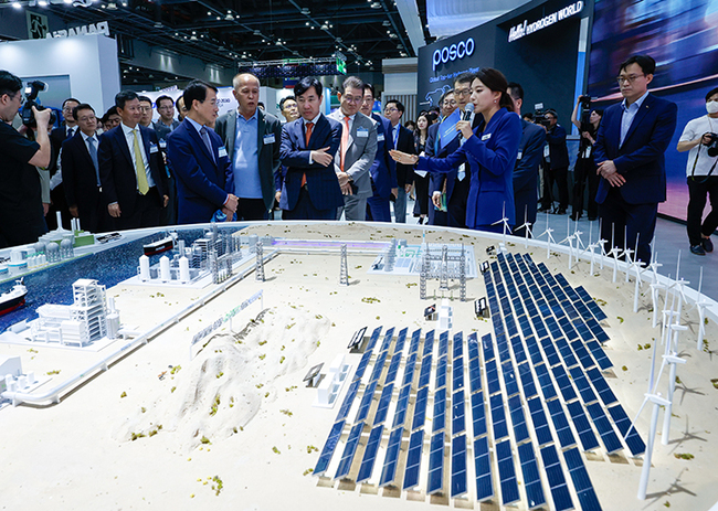 ▲ 경기 고양시 일산서구 킨텍스에서 열린 수소산업전시회에서 관계자가 ‘오만 그린수소 생산 프로젝트’ 디오라마를 설명하고 있다. (ⓒ뉴스1,) 그동안 환경부는 73개의 협의체 참여기관과 밀접한 소통과 협력을 위해 1대1 전략회의를 수시로 개최해 프로젝트별 애로사항을 파악했다.