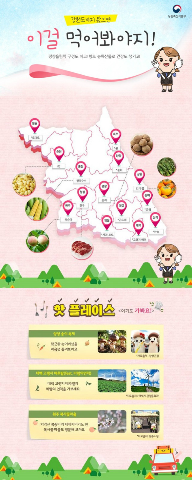 여름휴가를 강원도로 간다면 강원도 특산물은 꼭 먹어봐야죠! 평창올림픽도 구경하고, 향토 농특산물로 건강도 챙기세요.