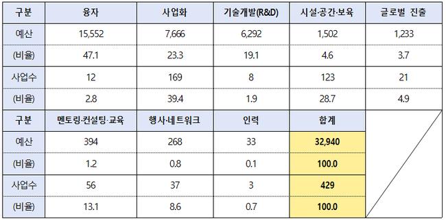 융자(47.1%, 1조 5,552억 원)가 가장 큰 비중을 차지하며, 사업화 지원(23.3%, 7,666억 원), 기술개발(R&D, 19.1%, 6,292억 원)이 뒤를 이었다. 글로벌 진출(3.7%)과 멘토링·컨설팅(1.2%) 지원 예산도 포함되어 있다.