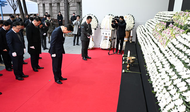 오세훈 서울시장이 31일(화), 서울시청 본관 정문 옆에 마련된 제주항공 여객기 사고 희생자 합동분향소에 방문해 조문하고 있다.