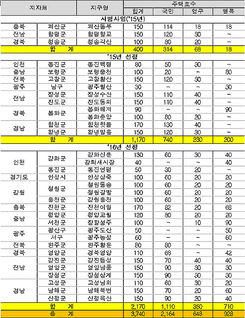 이번에 선정된 곳은 대부분 지방 도시 및 농촌의 읍·면 중심지로서생활 여건이 상대적으로 양호하고 임대주택 수요가 높은 지역이다.