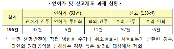196건을 구체적으로 보면 행정기관이 법정기간 내 처리하지 않거나 연장통보를 하지 않으면 자동처리된 것으로 간주하는 내용이 총 155건으로 ‘인허가 간주’ 47건, ‘협의 간주’ 11건, ‘수리 간주’ 97건이다.