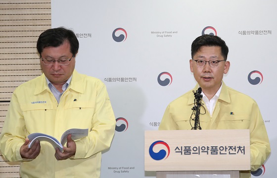21일 오후 충북 청주시 오송읍 식품의약품안전처에서 김현수 농림축산식품부 차관(오른쪽)과 최성락 식약처 차장이 살충제 검출 계란 유통량 추적조사 및 인체 위해성 평가를 발표하고 있다.(사진=연합뉴스 제공)최성락 식품의약품안전처 차장은 21일 “우리나라 국민 중에서 계란을 많이 먹는 상위 2.5%의 극단섭취자가 살충제가 최대로 검출된 계란을 섭취한다는 최악의 조건을 설정, 살충제 5종을 위해평가한 결과에서 건강에 큰 문제가 없는 것으로 확인했다”고 밝혔다.