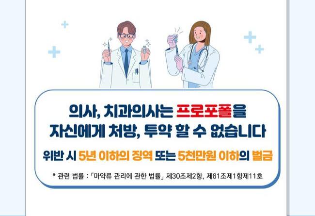‘프로포폴’은 의존성 우려가 높은 대표적 마약류로, 식약처는 이를 셀프처방한 의료인에 대해 5년 이하 징역 또는 5천만 원 이하 벌금형을 부과할 방침이다. 마약류 전체에 대해서는 최대 10년 이하 징역 또는 1억 원 이하 벌금이 적용된다.