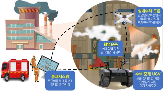 과기정통부는 복사열 200℃, 가시거리 1m 이하의 환경에서도 임무를 수행할 수 있는 드론과 육상 무인이동체(UGV)를 개발할 계획이다. 해당 무인이동체는 내열·내습 성능뿐만 아니라, 센서 융합, 상대항법 기술을 활용한 정밀 수색 기능도 갖추게 된다.