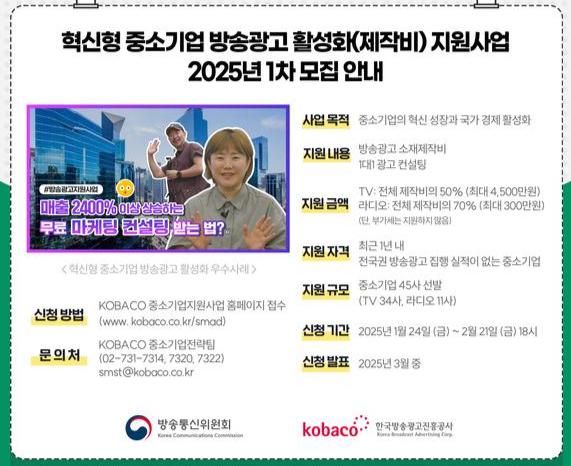 방송통신위원회는 한국방송광고진흥공사와 함께 중소기업과 소상공인의 방송광고 제작 및 송출비를 최대 90%까지 지원하는 `2025년 방송광고 제작지원사업` 공개 모집을 1월 24일부터 시작한다고 밝혔다.