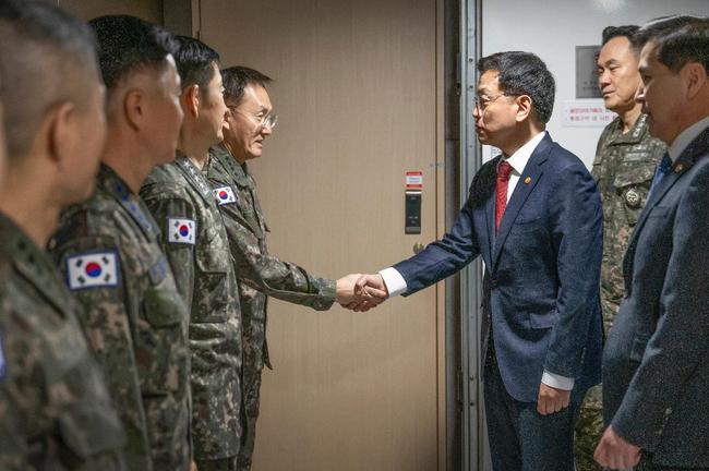 최상목 대통령 권한대행 부총리 겸 기획재정부 장관이 2월 7일 오전 합참 지휘통제실을 방문, 군 지휘부와 악수하며 인사를 나누고 있다.