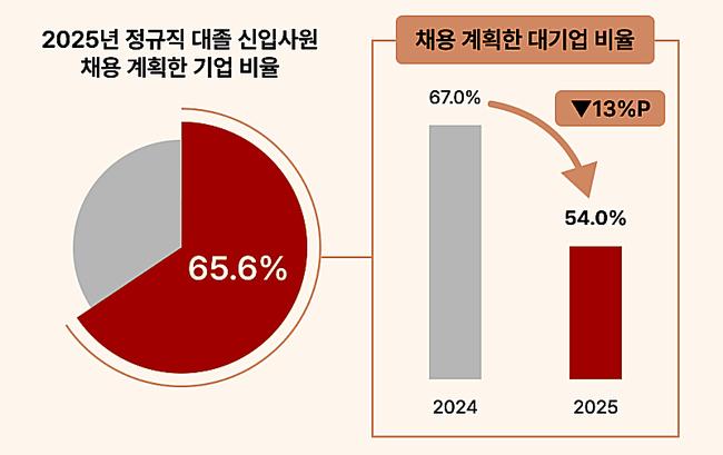 특히 채용 계획을 확정한 △대기업(54.0%)은 전년 대비 13.0%P 하락해 기업 규모 중 가장 큰 하락률을 보였다.