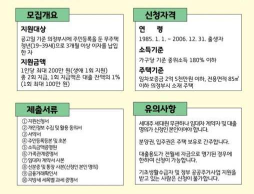 [일간환경연합 김경훈 기자] 의정부시(시장 김동근)는 청년들의 주거비 부담을 줄이고 안정적인 주거환경을 조성하기 위해 `청년 전·월세 보증금 대출이자 한시 지원사업`의 신청자를 3월 4일부터 31일까지 모집한다.