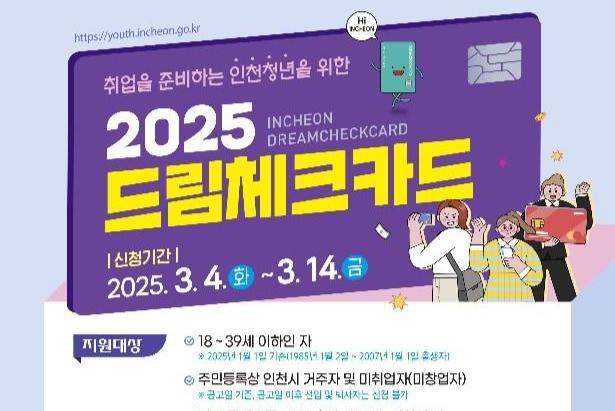 [일간환경연합 김경훈 기자] 인천광역시(시장 유정복)는 미취업 청년의 구직활동을 지원하는 `2025년 드림체크카드 사업` 참여자를 오는 3월 14일까지 모집한다.