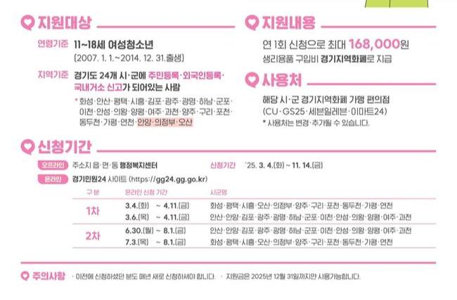 신청 대상은 24개 시군에 거주하는 11∼18세(2007∼2014년 출생) 여성청소년이다. 도는 참여 시군 확대에 따라 올해 여성청소년 약 27만 3천(외국인 등 6천 명 포함)이 혜택을 받을 것으로 예상한다. 이는 지난해 대비 4만 8천여 명이 증가한 수다. 지원금도 작년보다 월 1천 원 증액해, 1인 최대 연 16만 8천 원을 지역화폐로 지급한다.