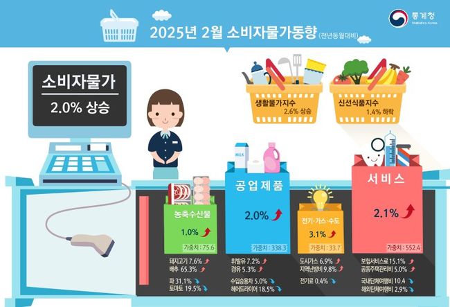 통계청이 발표한 2월 소비자물가지수(CPI)는 112.06(2020년=100)으로, 전월 대비 0.3%, 전년 같은 달 대비 2.0% 각각 상승한 것으로 나타났다.