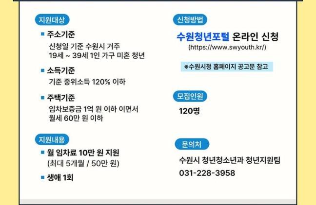 기준 중위소득 120% 이하(2025년 건강보험료 기준 10만 2613원)이면서 임차보증금 1억 원 이하, 월세 60만 원 이하인 민간 건물에 거주하는 무주택자 청년이 대상이다. 신청일 기준으로 수원시 내 주택에 임대차계약이 체결돼 있어야 한다.