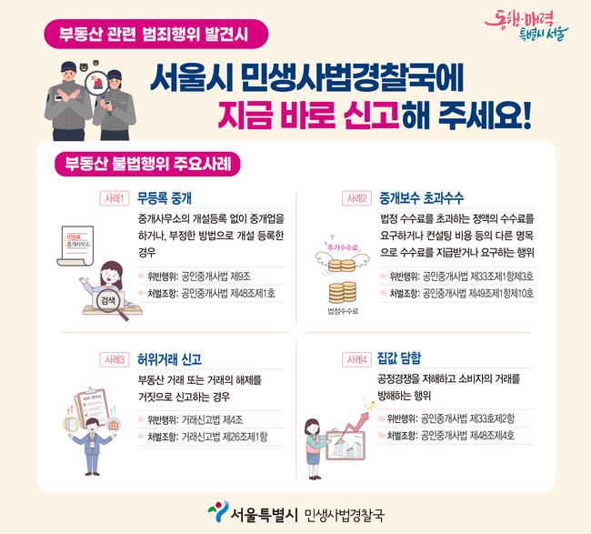 서울시 민생사법경찰국은 지난 2~3월 토지거래허가구역 지정 해제 기간 동안 부동산 거래량이 증가하고 매매 호가가 상승하는 분위기를 틈타 발생한 집값 담합, 허위거래 신고, 무등록 중개 등 부동산 시장 교란행위를 집중적으로 수사하고 있다고 밝혔다.