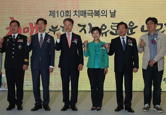 박능후 보건복지부 장관(왼쪽 세번째)이 18일 서울 코엑스에서 열린 제10회 치매극복의 날 기념식에서 양승조 국회보건복지위원장, 방송인 김미화 씨 등과 함께 치매 국가책임제 선포와 관련해 포즈를 취하고 있다. (사진=연합뉴스 제공) |