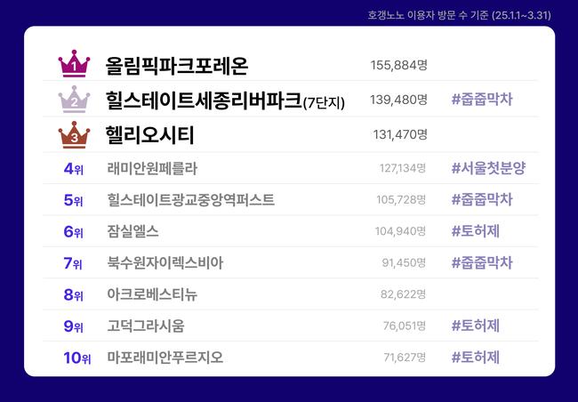 [일간환경연합 김경훈 기자] 국내 대표 프롭테크 기업 직방이 운영하는 아파트 종합 정보 플랫폼 ‘호갱노노’가 2025년 1분기(1~3월) 동안 가장 많은 방문자 수를 기록한 인기 아파트 랭킹을 3일 공개했다.