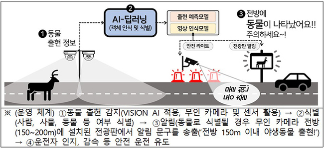 이 시스템은 인공지능 기술 기반의 CCTV와 라이다 센서를 설치해 동물 출현을 감지하고, 150m 전방에 설치한 LED 전광판에 '전방 150m 이내 야생 동물 출현' 문구를 실시간으로 송출한다.