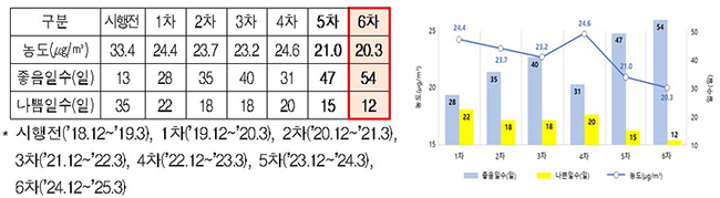 특히 제5차 미세먼지 계절관리제에 비해 '좋음일수'는 7일 증가했고, '나쁨일수' 또한 3일 감소했다.