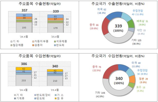 한편 올해 들어 4월 20일까지 누적 수출은 1,937억 달러로 전년 동기 대비 2.7% 감소했으며, 누적 수입은 1,866억 달러로 3.5% 줄어들었다. 이 기간 누적 무역수지는 71억 달러 흑자를 기록했다.