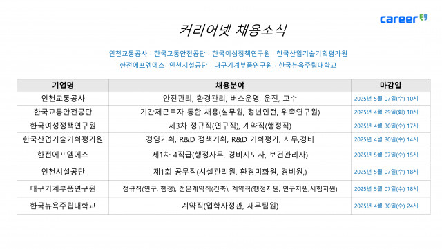 [일간환경연합 김경훈 기자] 취업 포털 커리어넷이 인천교통공사, 한국교통안전공단, 한국여성정책연구원 등 8개 공공기관의 채용 소식을 24일 발표했다.