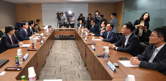 강성천 산업통상자원부 차관보(왼쪽 두 번째)가 11일 오후 서울 중구 남대문로 대한상의에서 열린 미국발 세탁기 세이프가드 대책 마련을 위한 회의에서 가전업계 관계자들에게 인사말을 하고 있다. (사진= 연합뉴스 제공)[일간환경연합 장민주기자]정부는 11일 서울 중구 대한상공회의소에서 삼성전자와 LG전자 등 국내 세탁기 업계와 대책회의를 열고 미국 국제무역위원회(ITC)의 동향을 공유하고 향후 대응방안에 대해 집중 논의했다.