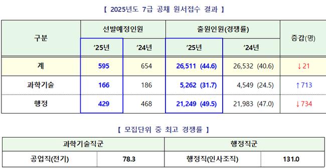 직군별로는 과학기술직군이 166명 모집에 5,262명이 지원해 31.7대 1의 경쟁률을, 행정직군은 429명 모집에 2만 1,249명이 출원해 평균 49.5대 1의 경쟁률을 기록했다.