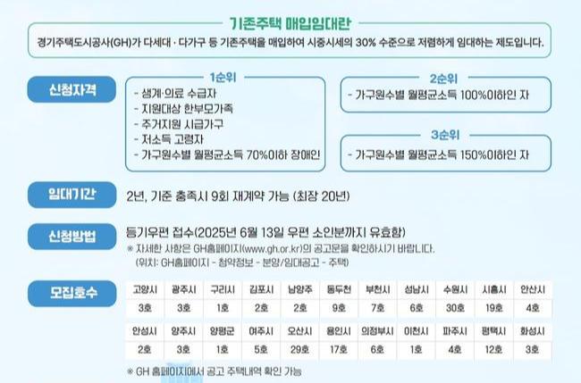 [일간환경연합 김경훈 기자] 경기주택도시공사(GH)는 경기도 내 취약계층의 주거안정을 위해 매입임대주택 입주자를 모집한다고 26일 밝혔다.