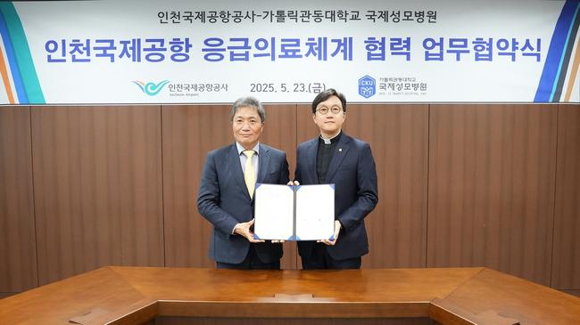 [일간환경연합 신상미 기자] 인천국제공항공사(사장 이학재)는 지난 23일 공사 회의실에서 가톨릭관동대학교 국제성모병원(병원장 고동현)과 `인천국제공항 응급의료체계 강화를 위한 업무협약(MOU)`을 체결했다고 26일 밝혔다.