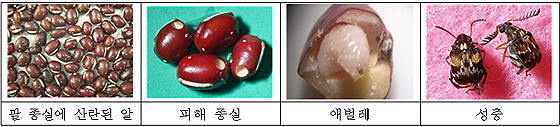 팥바구미의 알, 애벌레 및 성충과 피해 종실