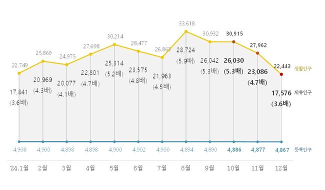 [일간환경연합 한선미 기자] 행정안전부는 26일 ‘2024년 4분기 인구감소지역 생활인구 산정 결과’를 발표하며, 지난해 12월 기준 인구감소지역의 생활인구가 약 2,244만 명, 이 중 체류인구가 약 1,757만 명으로 등록인구의 약 3.6배에 달한다고 밝혔다.