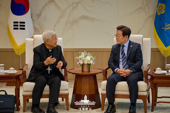 이재명 대통령이 7일 오후 2시 대통령실에서 교황청 성직자부 장관 유흥식 추기경을 접견하고 있다.