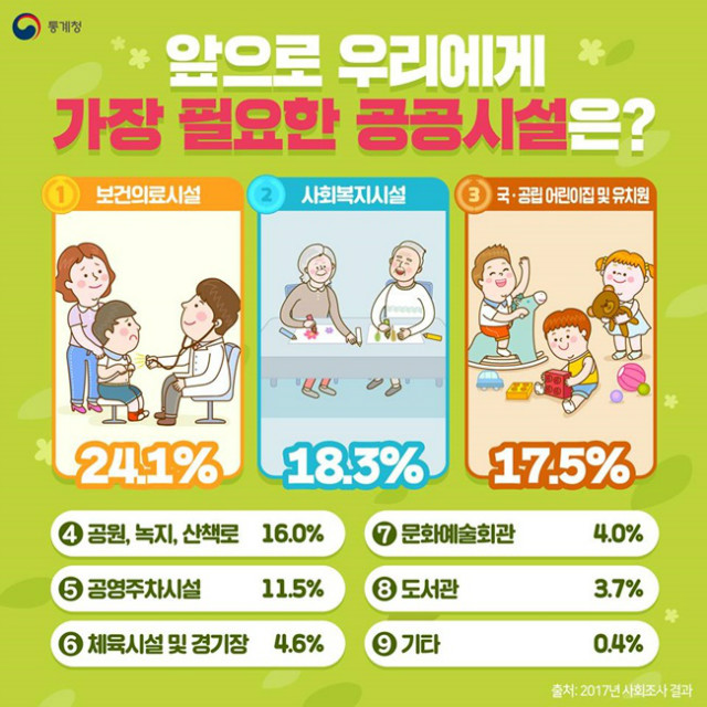 [일간환경연합 장민주기자]통계청이 7일 발표한 ‘2017년 사회조사 결과’에 따르면 향후 필요하거나 늘려야 할 공공시설로 ‘보건의료시설(24.1%)’을 가장 많이 꼽았습니다. 이어 사회복지시설(18.3%)과 국공립 어린이집 및 유치원(17.5%)이 필요하다고 대답했습니다.