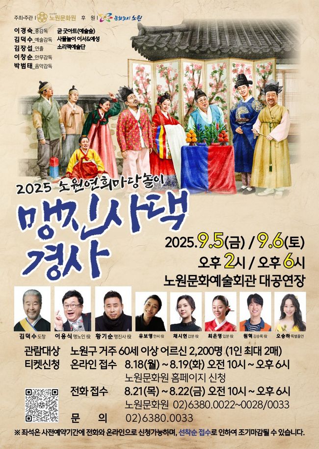 [일간환경연합 김경훈 기자] 노원구가 노원문화원과 함께 지역 어르신을 위해 연희마당놀이 <맹진사댁 경사>를 전석 무료로 선보인다.
