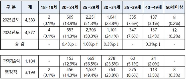 성별 비율은 남성이 59.8%(2,623명), 여성이 40.2%(1,760명)로 확인됐다. 합격자 평균연령은 28.8세로 전년(28.9세)과 비슷한 수준을 유지했다.