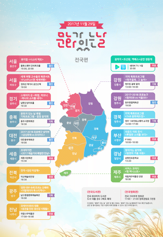 [일간환경연합 장민주기자]11월 문화가 있는 날인 29일을 전후해 전국에서 공연·전시 등 2600여개의 문화예술행사가 펼쳐진다.