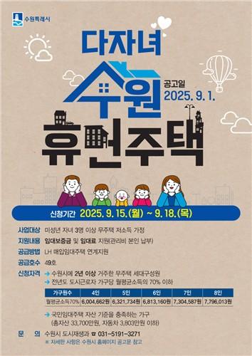 [일간환경연합 한선미 기자] 수원시(시장 이재준)가 9월 15일부터 18일까지 `다자녀 수원휴먼주택` 입주자`를 모집한다.