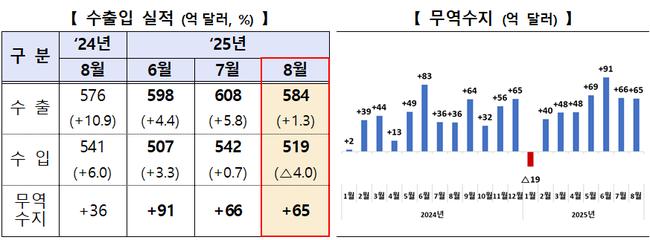 산업통상자원부에 따르면 8월 수출은 전년 동월 대비 1.3% 증가한 584억 달러, 수입은 4.0% 감소한 518억 9천만 달러를 기록했다. 조업일수가 하루 줄었음에도 일평균 수출은 26억 달러로 5.8% 늘었다.