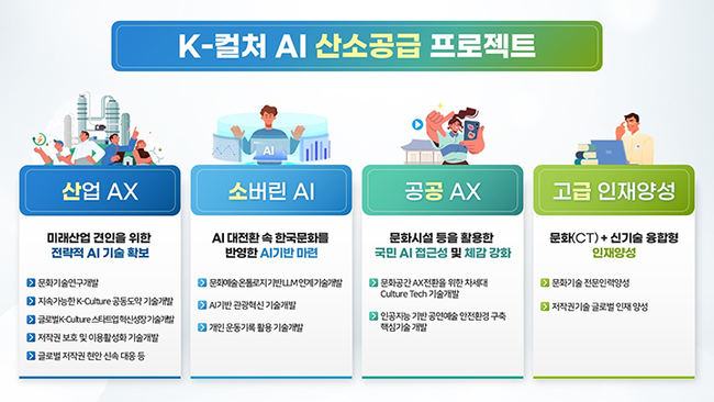 이를 통해 콘텐츠산업의 기획부터 제작, 수출 전 과정에 인공지능 기술을 도입해 산업의 인공지능 전환(AX)을 도모하고, 한국문화를 반영한 인공지능 기술을 개발해 자국 인공지능(소버린 AI)을 강화한다.