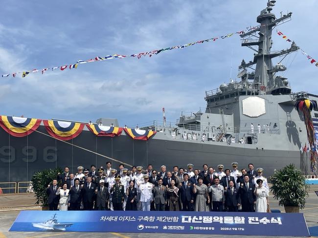 [일간환경연합 김경훈 기자] 주광덕 남양주시장은 17일 울산 HD현대중공업 조선소에서 열린 차세대 이지스 구축함 `다산정약용함` 진수식에 참석했다. `다산정약용함`은 정조대왕급(KDX-Ⅲ Batch-Ⅱ) 2번함으로, 첨단 전투체계를 갖춘 대형 해군 구축함이다.