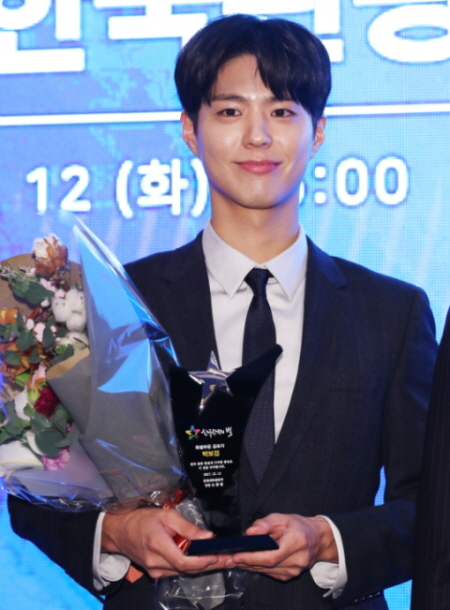 ‘2017 한국관광의 별’ 시상식에서 특별분야 공로자부문에 선정된 배우 박보검. (사진=연합뉴스 제공)지난 2월 포브스코리아가 발표한 ‘2017 파워 셀러브리티 1위’를 차지했고 최근 아시아 8개국에서 진행된 팬미팅을 성황리에 마무리하며 한류스타로서 우리나라를 전 세계에 알리는 데 크게 공헌했다. 그 결과 ‘2017 한국관광의 별’에 선정됐다.