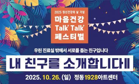[일간환경연합 신상미 기자] 대한신경정신의학회와 대한정신건강재단은 ‘2025 정신건강의 날’을 맞아 오는 10월 ‘마음건강 Talk Talk 페스티벌 - 내 친구를 소개합니다Ⅱ’를 개최한다. 이번 행사는 정신건강의학과 의사, 환우, 시민, 그리고 사회 각계의 인사들이 한자리에 모여 마음을 나누고 위로를 전하는 공감의 장으로 마련됐다.