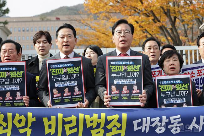 오후 과천 법무부 앞에서 열린 현장 규탄대회에서 공세는 정성호 장관을 겨냥했다. 송 원내대표는 “검찰의 대장동 비리 사건 항소 포기는 대한민국 사법 시스템의 자살 선고이다”라며 “대장동 범죄 집단의 변호사, 정성호 법무부 장관은 사퇴하라”고 촉구했다.
